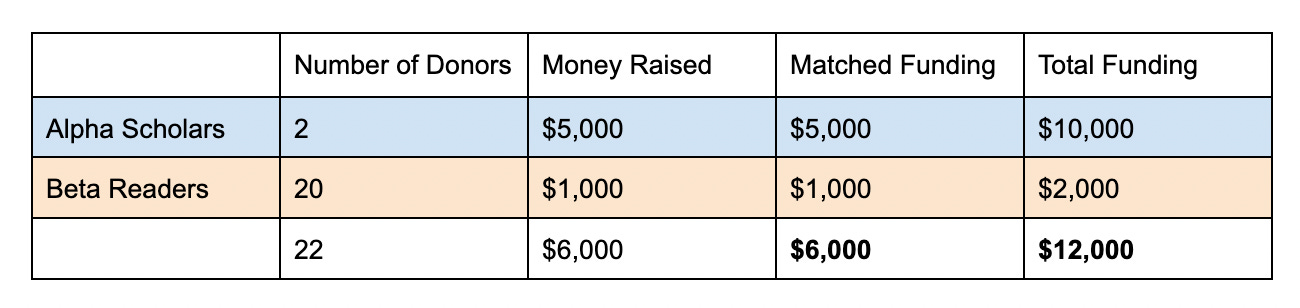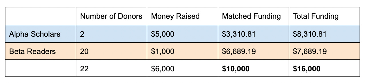 Notice that Beta Readers receives over 2x more matched funding than Alpha Scholars, even though Alpha Scholars raised more money.